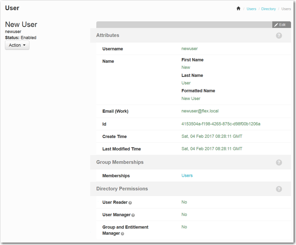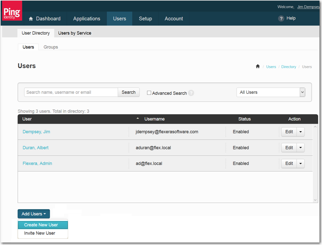 1. Log into Ping Identity as an admin and open the User Directory > Users tab on the Users menu. The Users view opens.
