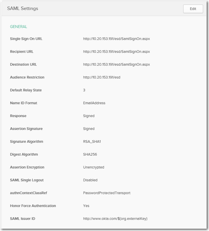 1. Logon to your identity provider platform’s web site and open the page containing your account’s SAML settings. The following are the SAML Settings in Okta: