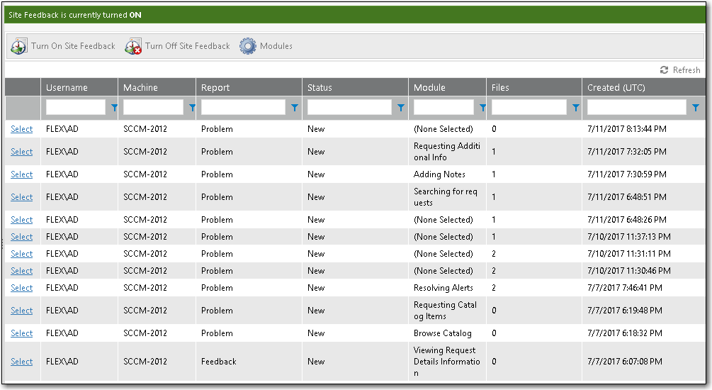 To view the details of a feedback submission, click Select next to the feedback issue you want to view. The Feedback Details view opens, displaying both the text of the submitted feedback issue and a list of the files that were uploaded with the feedback issue.