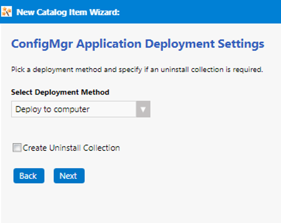 To add an uninstall collection to this catalog item, select the Create Uninstall Collection option. When this option is selected, users will be able to submit an uninstall request from App Portal, and System Center Configuration Manager will uninstall the application. App Portal will inform the user when the uninstall is complete.