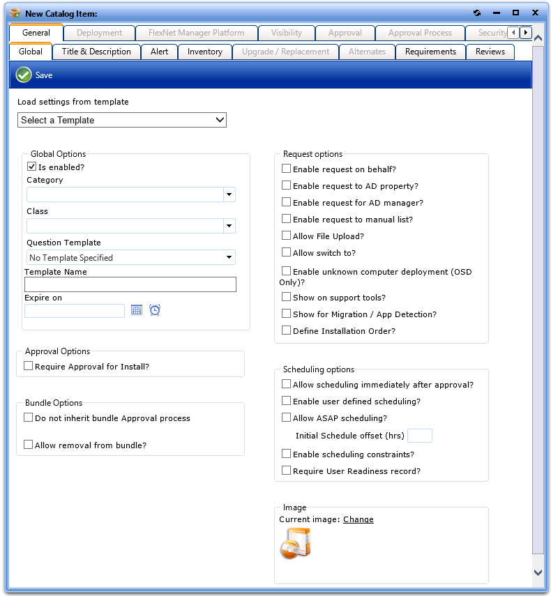 Under Create New Catalog Item, click on New Software Catalog Item. The General > Global tab of the New Catalog Item Properties dialog box opens.
