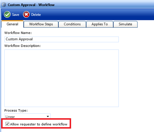 7. Create a new approval workflow and choose the Allow requester to define workflow option.