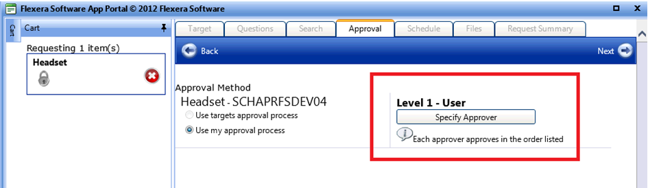 9. Attach the approval workflow to a catalog item. When you checkout the software, you will see the following screen with the option to specify the approver: