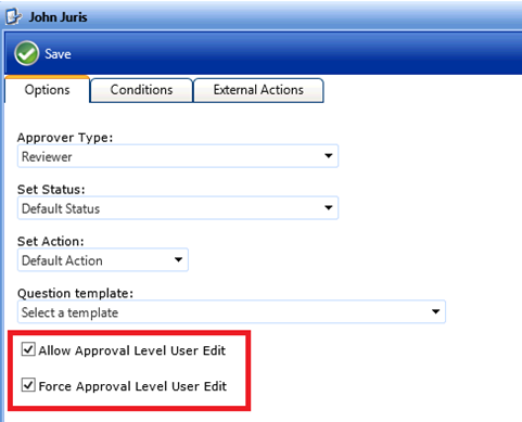 8. Create a new workflow step, assign a default approver, and choose the Allow Approval Level User Edit and Force Approval Level User Edit options.