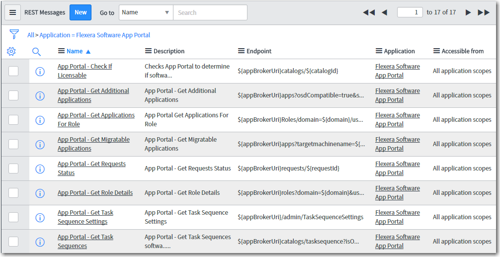 Under Flexera Software App Portal in the menu, click on Rest Messages. The Rest Messages view opens.