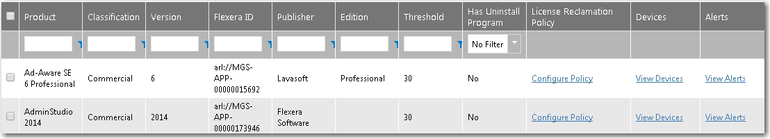 Optionally, click Configure Policy in the License Reclamation Policy column to set policy options for this application such as the license reclamation threshold and whether to automatically uninstall this application. See Configure License Reclamation Policy for more information.