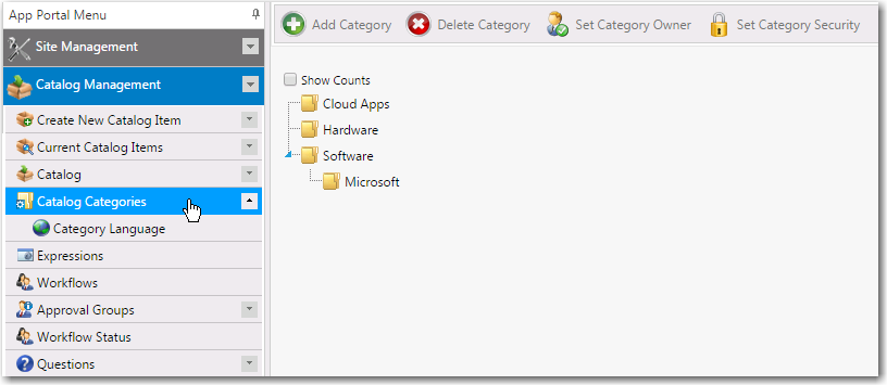 Under Catalog Management, select Catalog Categories. Existing categories are listed in the right pane.